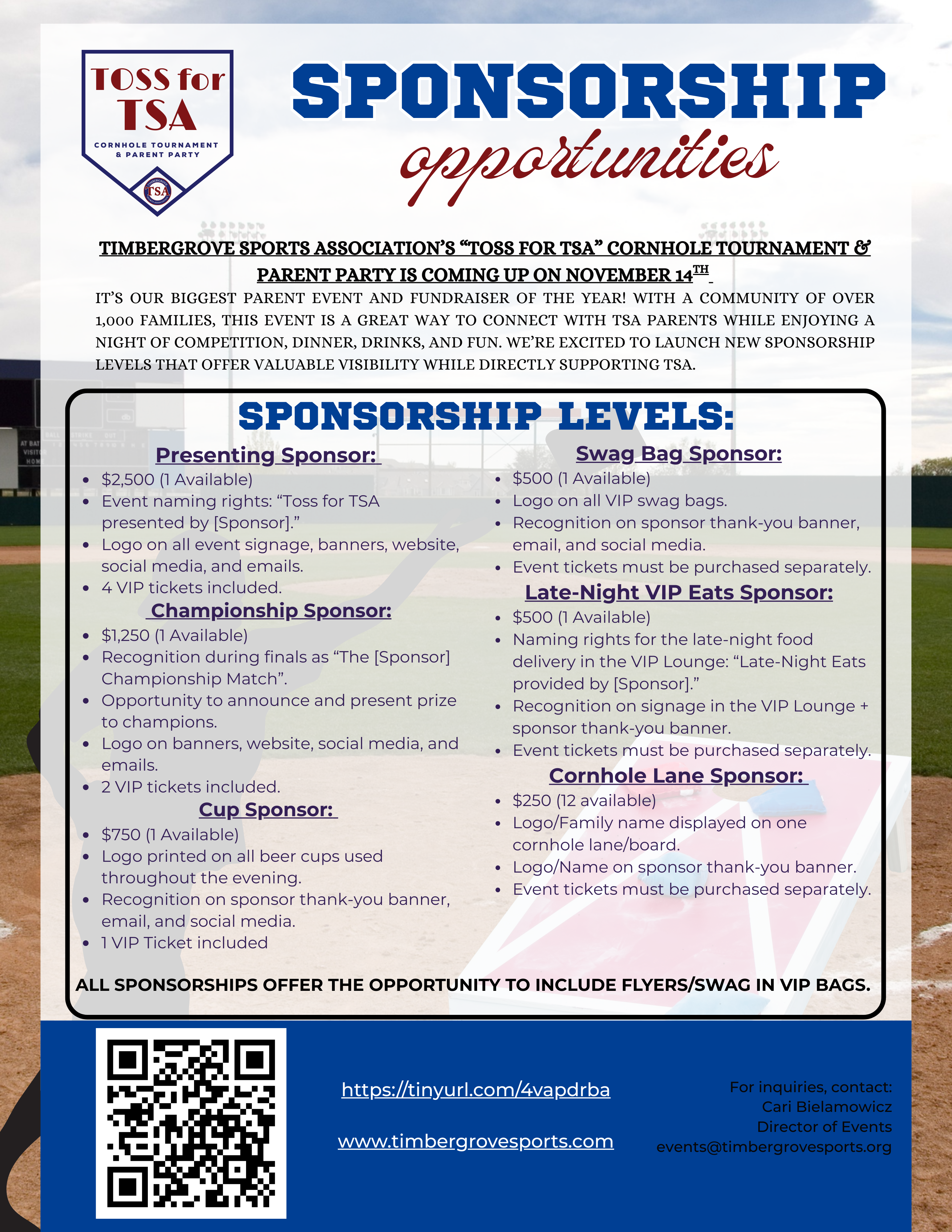 Toss for TSA, our biggest parent party and fundraiser of the year, is back this November 14th — this time with a couple of exciting new twists to spice things up! Enjoy dinner, drinks, music, games, and our annual cornhole tournament, all benefiting TSA. Tickets go on sale in mid-October, so mark your calendars now